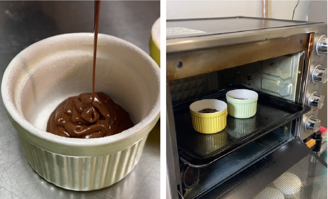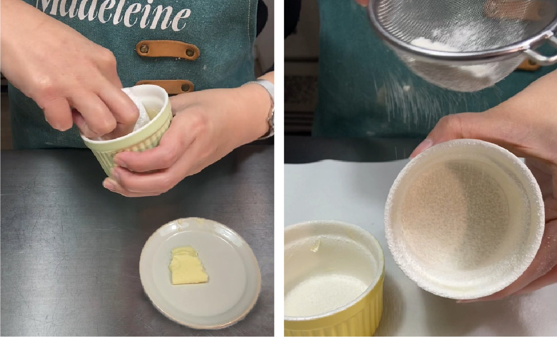 1) 先在小烤盅內均勻抹上已室溫軟化的奶油並灑上少許麵粉,可避免糕體沾黏、難脫模