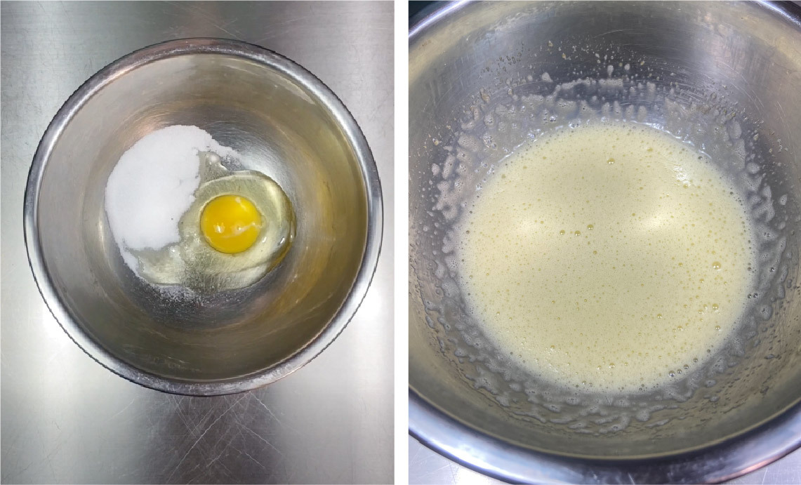 2) 將蛋及糖加入鋼盆並持續攪打至鵝黃色,表面出現綿密的小泡泡