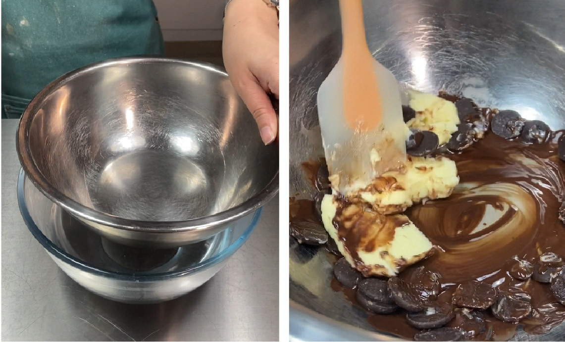 3) 將巧克力與奶油隔水加熱融化,並攪拌均勻
