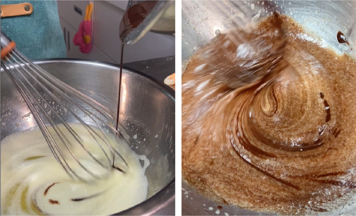 4) 將巧克力液慢慢倒入蛋糊中,一邊加入一邊攪拌至順滑