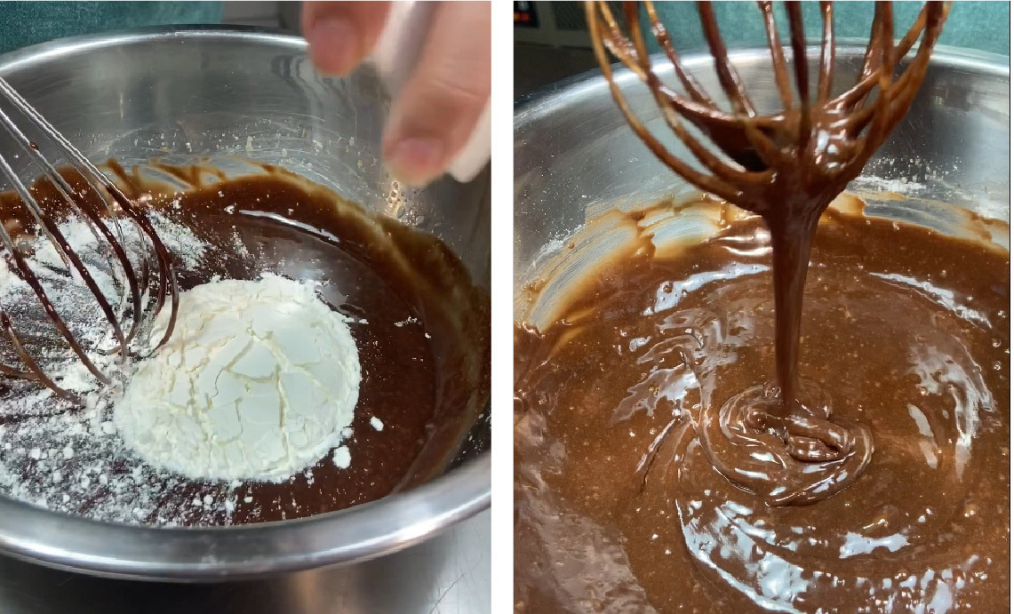 5) 麵粉過篩後倒入巧克力糊中,攪拌至看不見麵粉即可