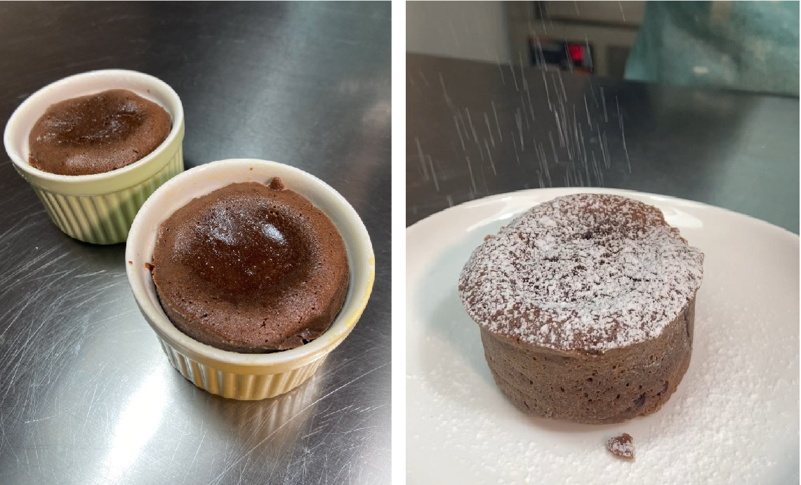 熔岩巧克力蛋糕在製作上有分成兩種版本,一種是將蛋糕烤至半熟狀態,讓其切開來時中間會流心;另一種則是直接在內裡包入甘納許