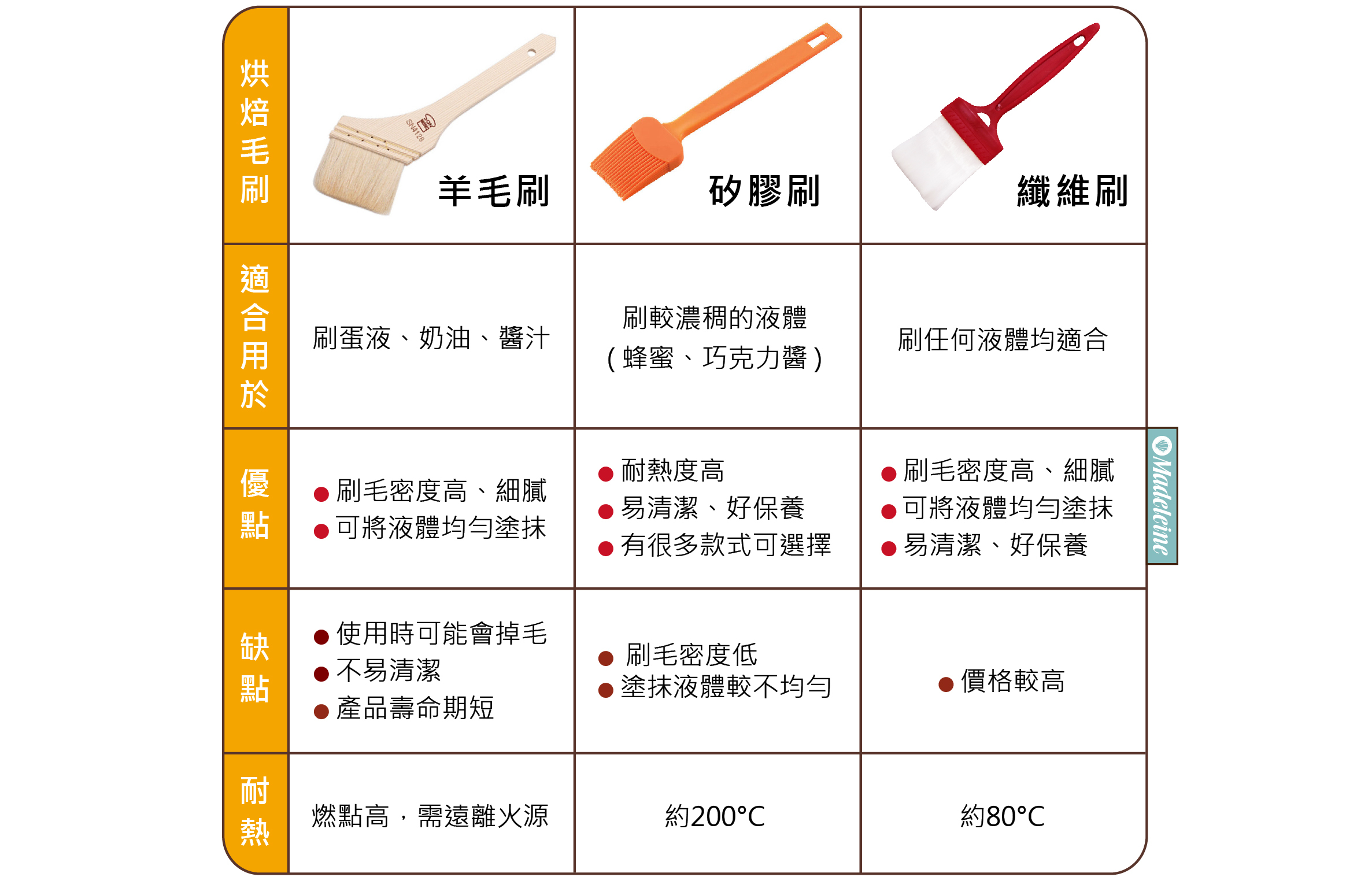 另外,市面上的毛刷種類繁多、價格也落差很大,在你購入烘焙毛刷前不妨先看看以下對於各毛刷的優缺點分析與正確使用吧 !