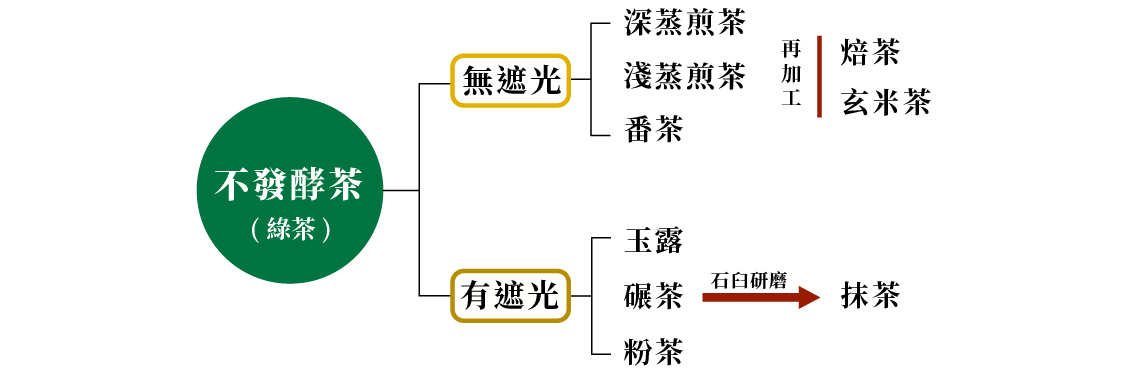 其中可以分為在栽種期間無遮光的煎茶、番茶等,及有遮光的玉露、碾茶、莖茶等,抹茶為碾茶研磨後得到的粉末;焙茶及玄米茶則為煎茶或番茶再加工製成,所以也被稱作再加工茶