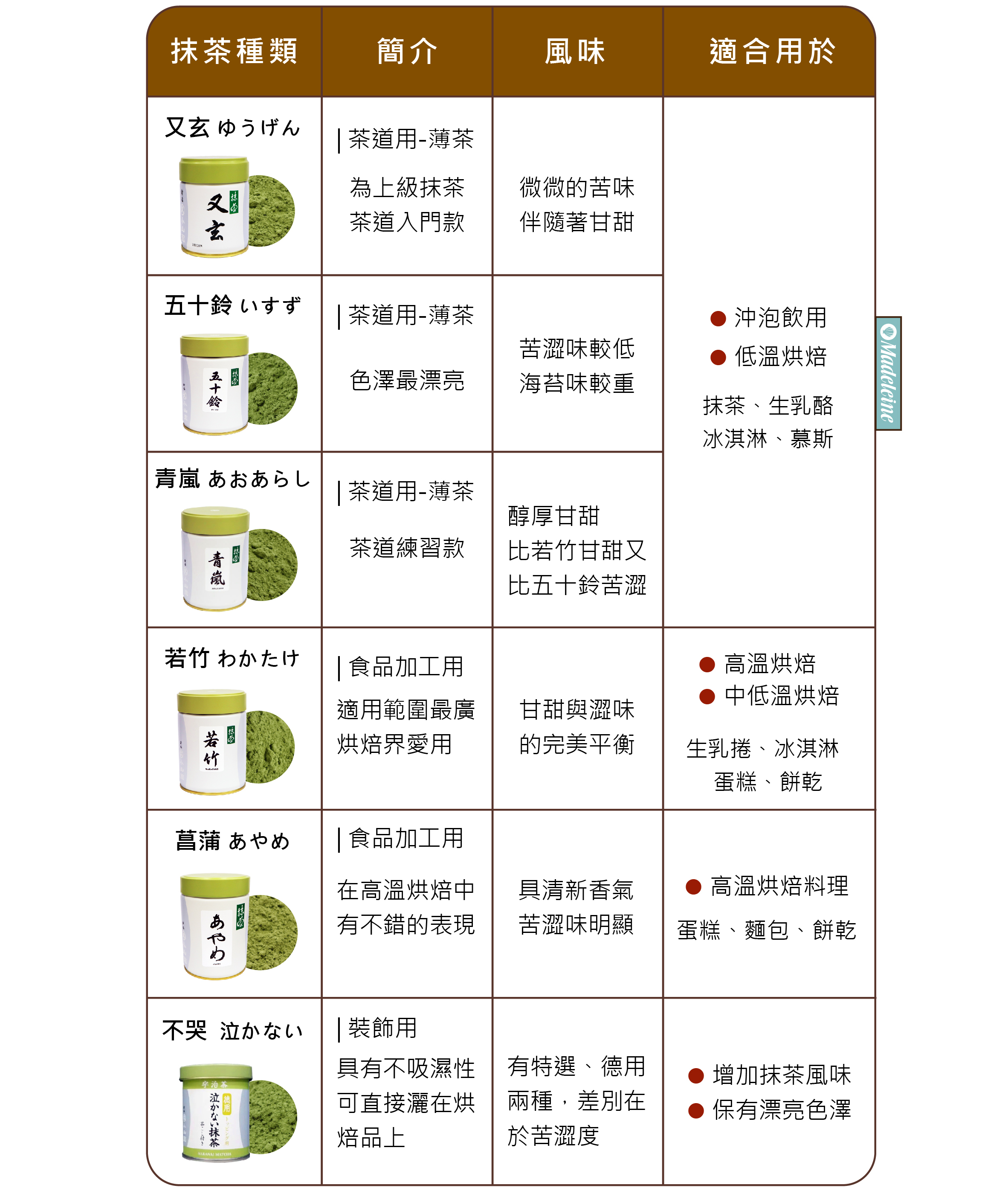 ~ 以下為烘焙中常用到的六種抹茶~