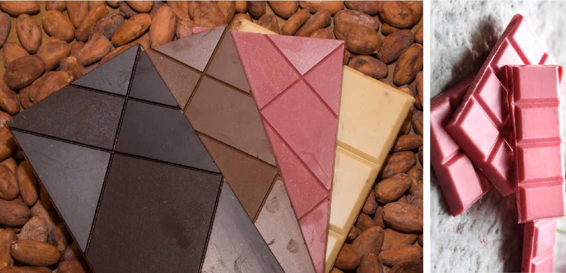 紅寶石巧克力的顏色是來自於其本身就成粉色的可可豆,而這種擁有粉色種子的可可果其實早就存在於自然界中,但是經過曝曬、烘焙等過程後都會變成深棕色,所以即使是用粉紅色的可可豆製作,最終也很難保留原色~