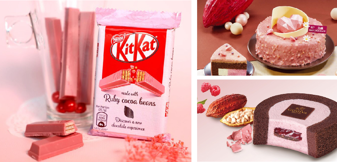 2018年Nestle雀巢率先與紅寶石巧克力聯名合作,在日本、韓國兩地推出KitKat Ruby,造成一波搶購熱潮,當時甚至登上日本伴手禮的排行榜,而後2019年台灣也更進上市紅寶石巧克力系列商品,像是85度C的紅寶石巧克力蛋糕、GODIVA的紅寶石巧克力慕絲蛋糕等,不知道當時的你有沒有嚐鮮到呢?