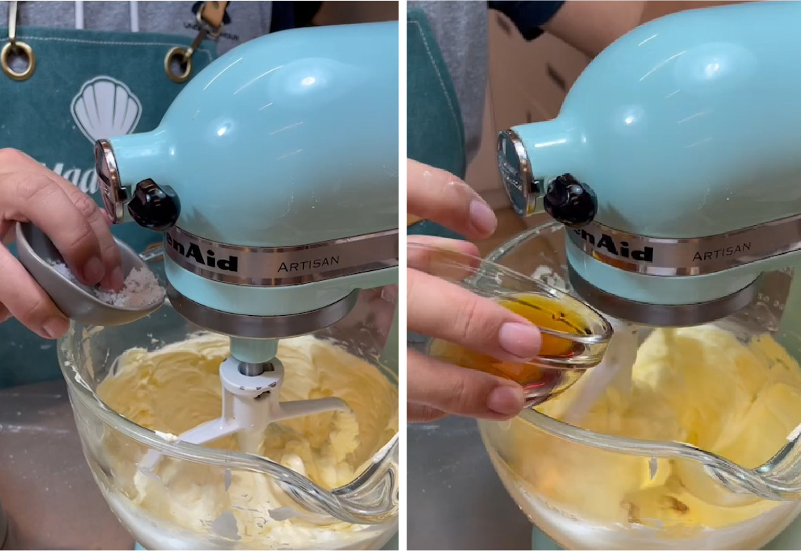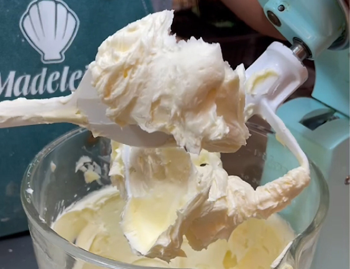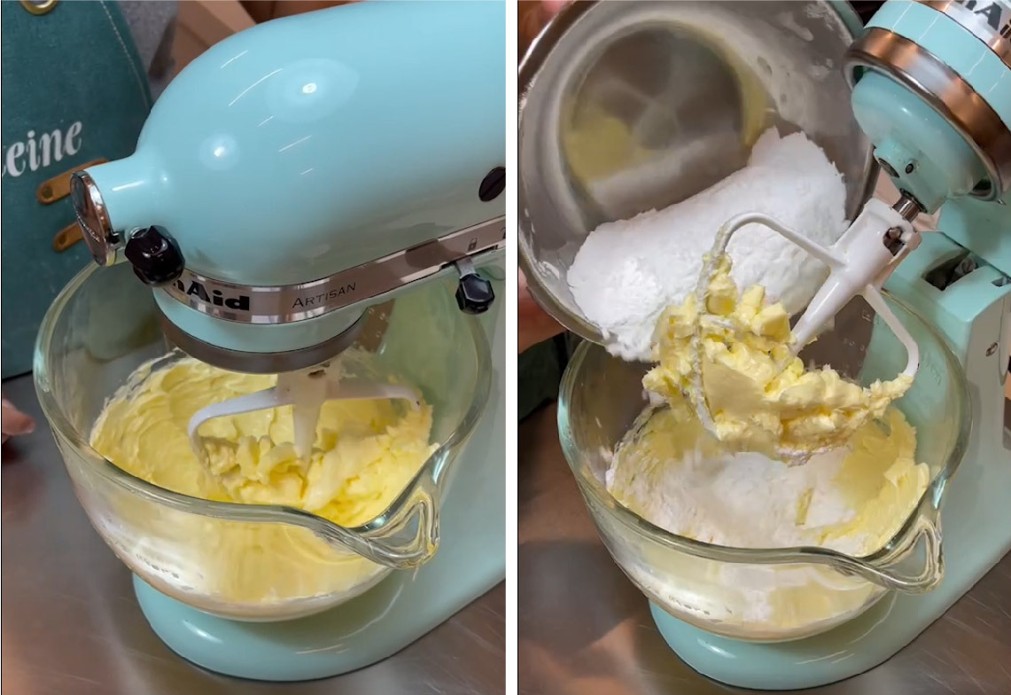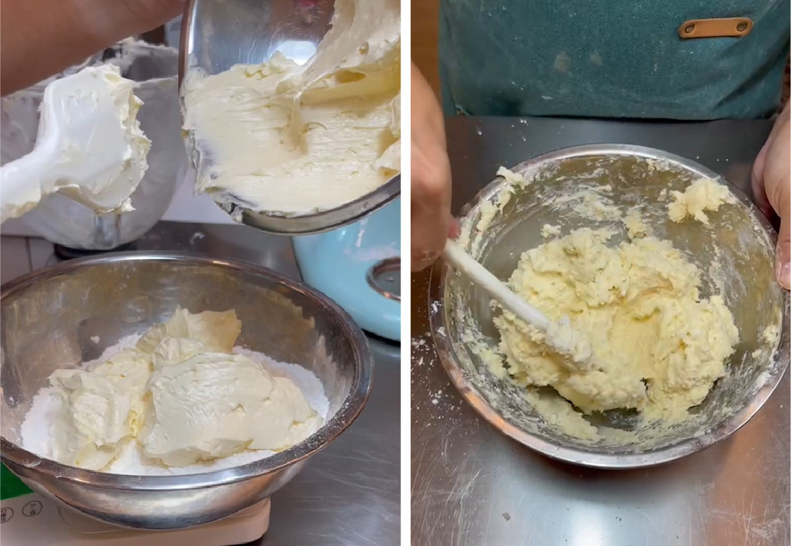 1) 奶油室溫軟化後與糖粉一起均勻打發