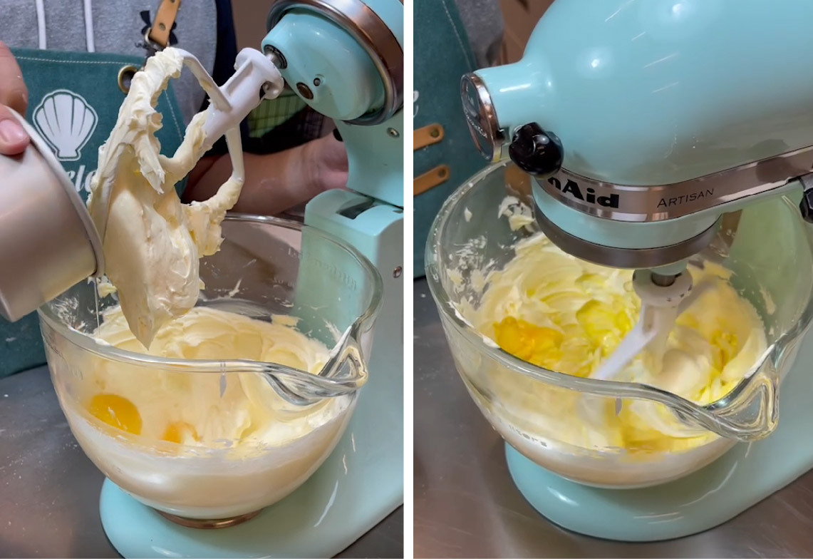 2) 分兩次加入蛋黃,待蛋黃完全融入後才可以加下第二次