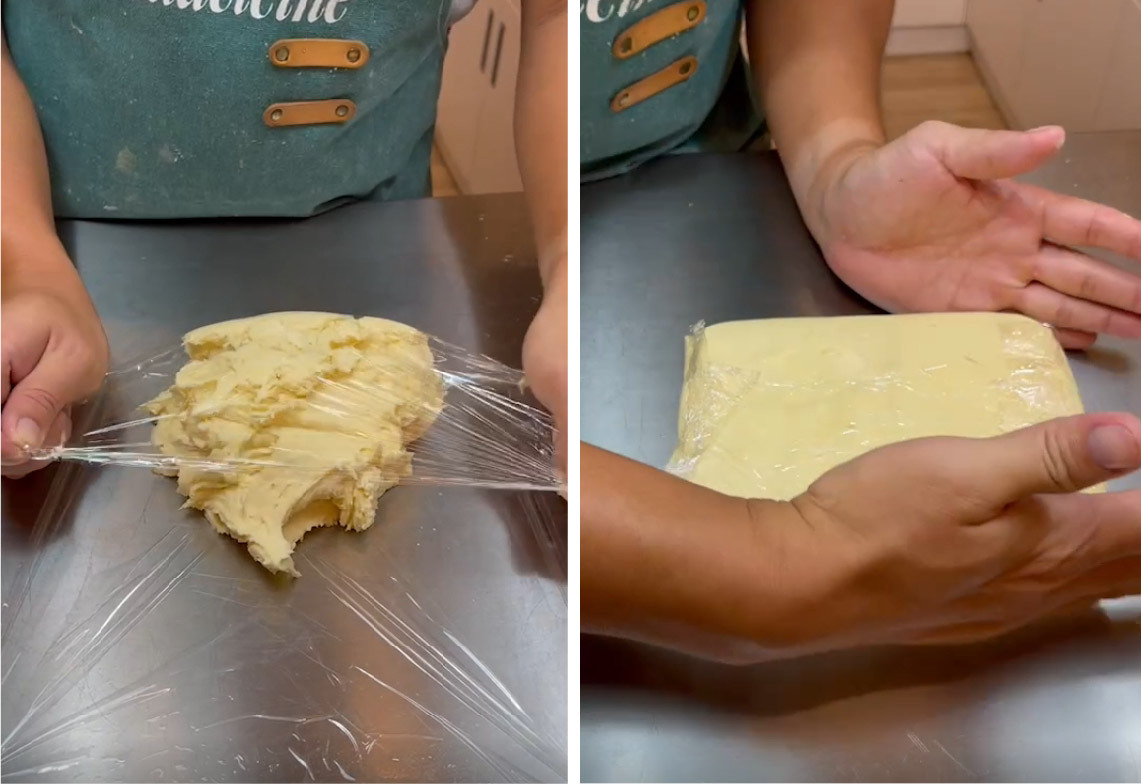 6) 將麵糊用保鮮膜包裹起來並微整成正方形,冷藏1小時