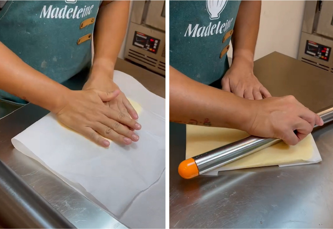 7) 用烘焙紙將麵糊包裹起來,並折成20x20cm (厚度約1cm)方形,使用擀麵棍將麵團桿成一樣的大小,塑型完成再冷凍10-15分鐘