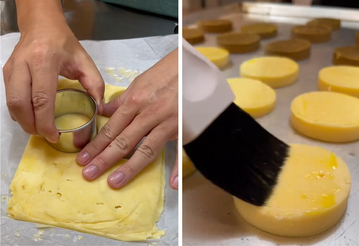 8) 壓出小圓餅後,在表面均勻刷上蛋黃液,待第一層乾掉後再刷上第二層,成色會更明顯漂亮