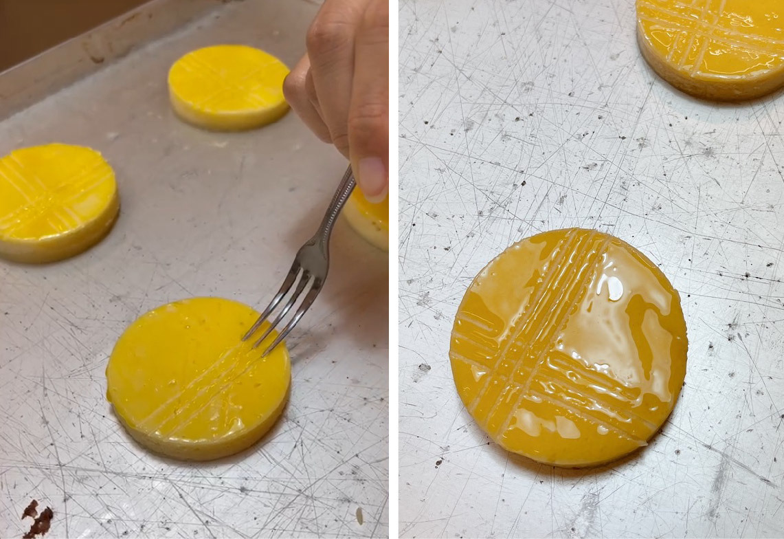 9) 待蛋黃液風乾後,再用小叉子畫上布列塔尼經典的交叉線條