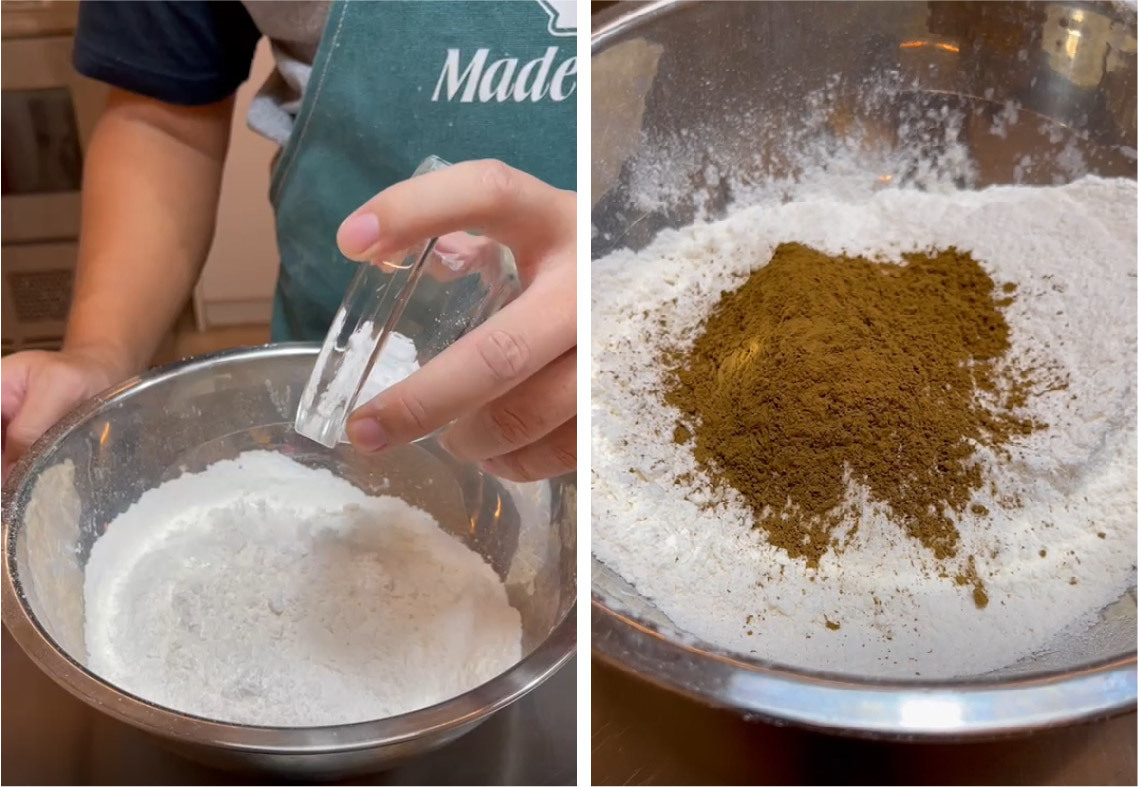 4) 泡打粉加進過篩好的麵粉中,如果要做其他種口味,就在此步驟再加入調味粉即可(右圖為伯爵紅茶粉),其他步驟都一樣