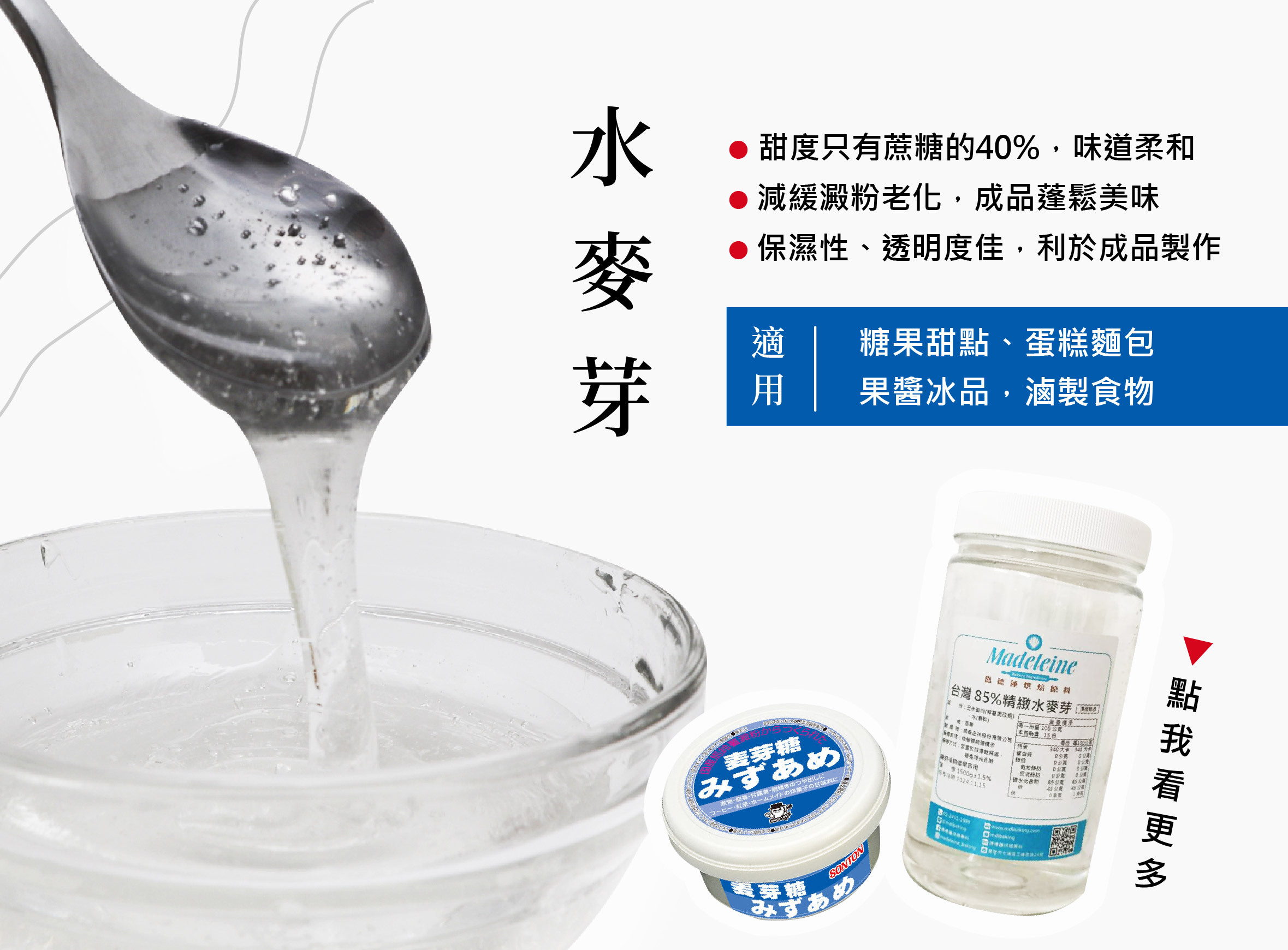 與古法麥芽糖不同,它是使用樹薯澱粉、玉米澱粉等精緻澱粉經化學反應而成,製程上快速又簡易,因其透明的色澤能更好用來染色,所以現代製作糖果大多都使用水麥芽,也可以用來製作果醬冰品、麵包烘焙,甚至是滷製食物等