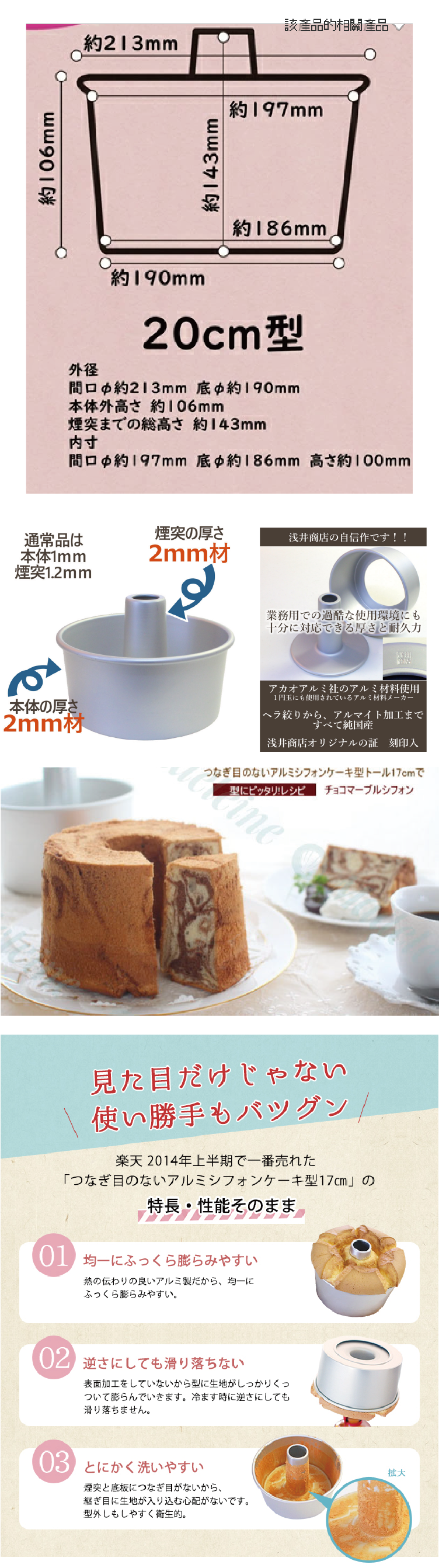 僅次於日本千代田名模的淺井商店模具,適合初學者使用,此戚風蛋糕模只需3個雞蛋即可。模具品質高,做工僅此于千代田,脫模后成型漂亮,是烘友們的不錯選擇,鋁製材質,具有良好的導熱性,並且飽滿而精美,沒有熱量不均的問題,且也很安全,即使倒置冷卻也不會滑落。