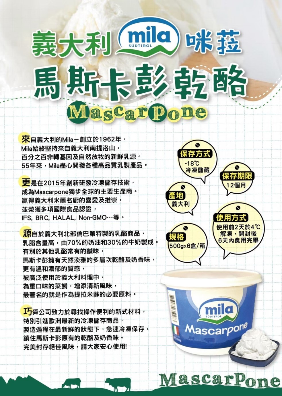 以獨特的冷凍保存技術領先全球,由70%奶油與30%牛奶製成,擁有天然淡雅的多層次奶香及溫和濃郁的質地,為重口味的菜餚增添清新風味。更是提拉米蘇不可或缺的原物料。