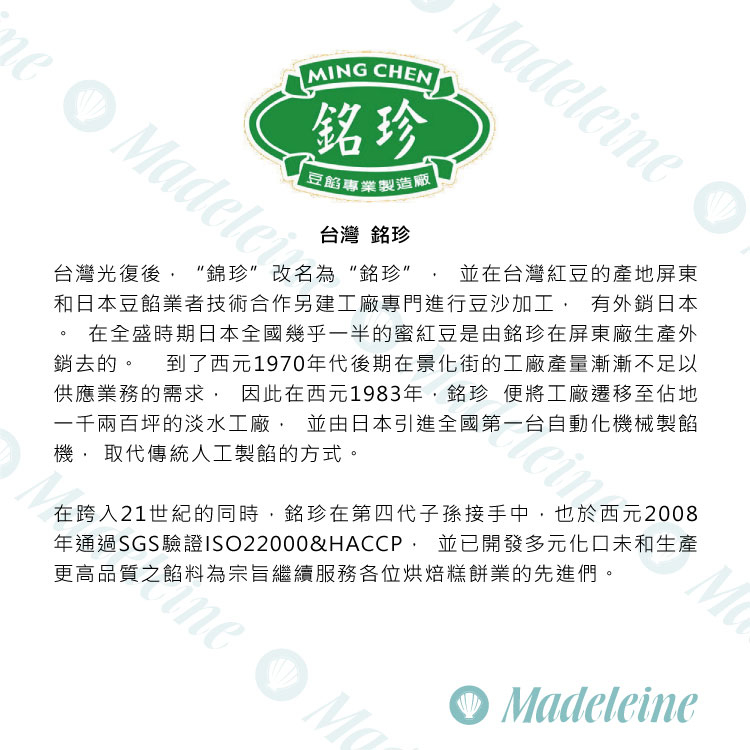 銘珍的豆沙細胞顆粒通過連日本豆沙同行都驚訝的300目極微細的濾網,相當於每顆豆沙的細胞顆粒只有小於48μm微米(=0.048mm)的大小才通的過濾網,只要是大於48μm微米的豆沙細胞顆粒都不被銘珍所採用! 所以這是銘珍豆沙口感超級綿密細緻的秘密!