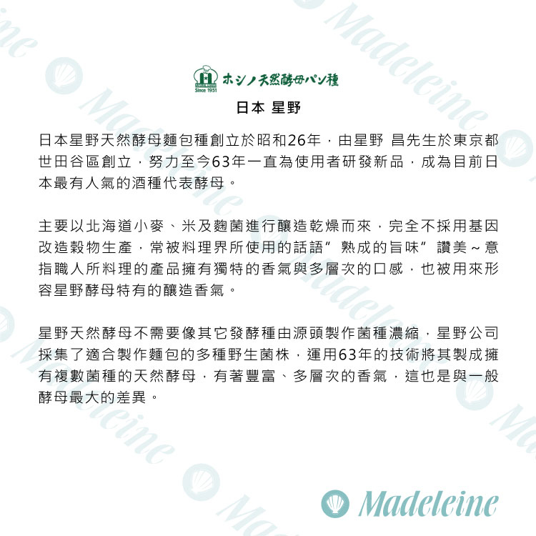 日本星野天然酵母,小麥粉種釀造香氣濃厚、風味層次分明,適合使用在軟式、歐式麵包上,可呈現出獨特的小麥香氣與吸水率,並達到內層組織濕潤且口感Q彈的特色。