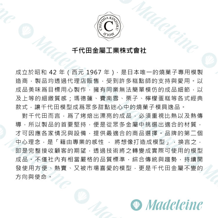 千代田烤模可謂是每位甜點迷心中的燒菓子模具逸品。採用不沾烤盤烘烤後產品易脫模,減少油料以及人工擦油以及環境的清洗工時,不但節省成本更能提高產能;矽利康不沾適用於高糖類產品,如蛋糕類產品(含糖量20%以下)
