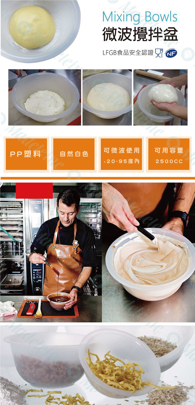 標準規格的使用規格,多用來盛裝材料準備、麵糊攪拌、調製醬料…等等多用途的PP塑料盆,不怕髒好清洗的光滑表面,即使是用作麵糰發酵也是沒問題的。特別適合製作巧克力,無須擔心處理巧克力時,因為溫度變化關係,無法順手處理,現在只要放進微波爐中加熱,就可以繼續進行巧克力的製作了,實在是非常方便。