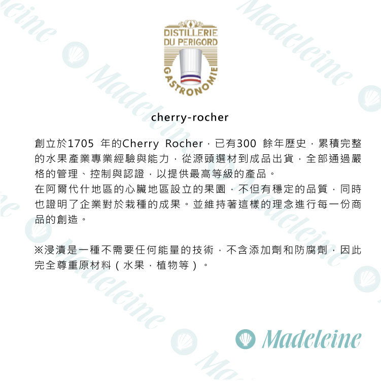 選用法國進口新鮮櫻桃以糖、 櫻桃酒加以浸泡,充分的吸收酒香與糖的風味而成,使得酸味、甜味、澀味層層疊加,醞釀出更加深厚濃郁的好味道。