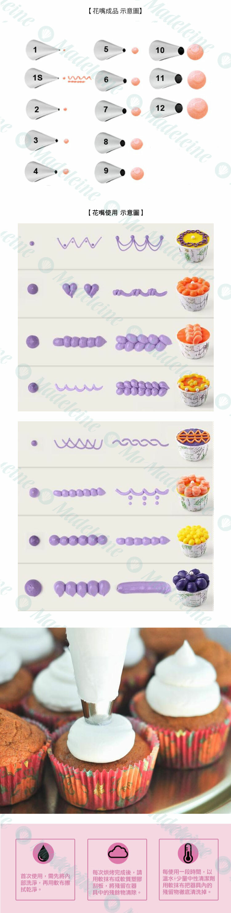 花嘴使用方法為,先將麵糊放入擠花袋後,用力擠向花嘴即可。304不鏽鋼花嘴設計,產品堅固美觀, 不易變形為增加花嘴使用壽命,使用完畢的花嘴應清洗乾淨晾乾後存放。
